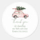 Adesivo redondo festivo com carro rosa aquarela, árvore de natal, visco e laços. Perfeito para selar envelopes, decorar pacotes ou brindes de festa de natal.