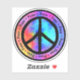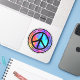 Adesivo Hippie - sinal de paz com texto ao redor num fundo multicolorido.