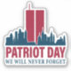 Este adesivo apresenta o World Trade Center e as Twin Towers com os textos "Nunca Esqueceremos" e "Dia Patriótico". É comemorar o ataque terrorista de 11 de setembro do World Trade Center. É perfeito para os sobreviventes, familiares, amigos e primeiros respondedores durante o ataque no seu aniversário de 20.