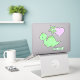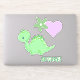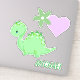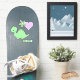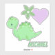 Um pequeno e bonito dinossauro bebê verde é o adesivo neste adorável conjunto. Junto com o dinossauro há uma flor verde e um coração cor-de-rosa. O nome do seu filho está em verde correspondente num autocolante separado.