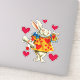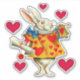 Vinheta-adesivo de corte personalizado com uma imagem antiga Alice no País das Maravilhas do Coelho Branco na região de cheio, rodeada de corações vermelhos brancos. Ver autocolante quadrado correspondente, bolsa de favor, caixa de favor, etiqueta de favor em forma de coração, sacos de presentes, etiqueta e papel de embalagem. Veja toda a coleção Wonderland Sticker nos CONVITES | Seção Stickers & Labels