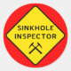 Inspetor Sinkhole - adesivo vermelho brilhante com estilo de aviso de diamante amarelo design e martelo rochoso cruzado gráfico.