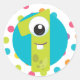 adesivo de aniversário do pequeno monstro UM para lembrancinhas ou selo de envelope com monstro um e bolinhas coloridas.
