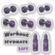 Vestir sua engrenagem de malhação com alguns adesivos de vinil de na moda com símbolos de malhação e treinamento de ginástica. Apresentando cores vibrantes arrojadas de sinos roxos e pretos em um casal de estilos diferentes com alguns motivos de garrafa d'água. As palavras adicionam motivação malhação para manter você funcionando. Quer você trabalhe no ginásio ou em casa, esses adesivos podem ajudar a inspirar suas sessões de malhação.