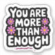 Este adesivo vibrante e animador apresenta a poderosa frase "Você é mais do que suficiente" em tipografia ousada e lúdica que irradia o amor próprio e o empoderamento. Ao redor do texto estão um conjunto de flores coloridas e faíscas, delicadamente arranjadas para melhorar a mensagem elevatória. Colocado contra um fundo cor-de-rosa suave, o design evoca calor, cuidado e positividade, o fazer é um belo lembrete da autoestima. Ideal para diários, espelhos, capas de telefone ou espaços de bem-estar mental, este adesivo inspira confiança diária e afirmação suave.