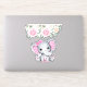 Decal de vinilo/adesivo de contorno com uma ilustração de aquarela de elefante rosa-giro. Ela tem orelhas bonitinhas, cor-de-rosa e bolinhas branca e arco bonito de fita rosa sobre a cabeça. O topo é decorado com um belo buquê de rosa.