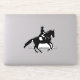 Um decal de vinilo com uma ilustração a preto e branco de um cavaleiro de vestimenta em traje formal. O cavalo e o cavaleiro estão tocando uma bela pirueta. Um elegante movimento clássico de vestimenta.