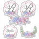 Elegante estilo aquoso design púrpura e rosa hydrangea apresentando delicadas coroas florais cor-de-rosa, aglomerado e pulverização. O conjunto inclui um vazio com campo de texto editável e dois com fonte de script personalizada - letra R.