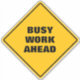 Sinais de cautela de diamante amarelo engraçado avisam sobre o trabalho ocupado em frente em uma espessa fonte de serifa negra. Um jogo de trocadilho com palavras de um sinal clássico, o caminho para a frente.