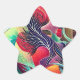 Uma composição vibrante apresenta uma intrincada mistura de formas giratórias e cores vívidas, formando uma paisagem abstrato. Elementos orgânicos como árvores e folhas são entrelaçados com padrões geométricos, criando uma cena dinâmica e harmoniosa.