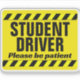 "Por favor, seja paciente". Avisem outros motoristas de que há um novo motorista na estrada! Vinheta decalcada da janela do motorista para novos motoristas, pais, condutores Ed, turma de educação de motoristas ou pais ensinando seus 16 anos de idade a dirigir. Fitas de aviso de perigo amarelas com texto em negrito amarelo e preto.