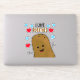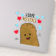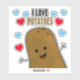 Batata marrom divertida e feliz cercada por corações de amor vermelhos e azuis com Eu Amo Batatas em letras pretas e marrons acima de sua cabeça.