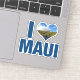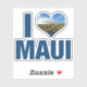 Eu adoro o adesivo Maui Hawaii com uma fotografia fofa em forma de coração do oceano havaiano azul e montanhas verdes. Belas águas costeiras me fazem feliz nas férias de verão. Design de fotografia bonitinha com moinhos de vento em uma colina.