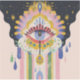 Evil eye charm bursts with sunny gold, blush, and cobalt on a midnight sky, framed by playful starbursts. Layered scallops and teardrop drips give it a bold modern talisman vibe—part folk, part pop. A bright statement for anyone who loves boho color and protective-symbol folklore.