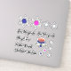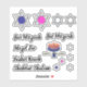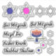 Uma bela folha de 15 etiquetas adesivas. Existem 9 adesivos de David falsos com bordos prateados - 5 são prateados planos, 2 têm um meio rosa claro e 2 têm um centro azul marinho. Há cinco modelos de script que fluem com as palavras "Bar Mitzvah", "Bat Mitzvah", "Mazel Tov", "Yasher Koach e "Shabbat Shalom", respectivamente. O último adesivo é uma obra de arte gráfica de nove velas vermelhas brilhantes em uma menorah com as palavras "feliz chanukah" abaixo das velas.