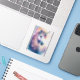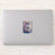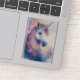 Um adesivo transparente de um monocórnio majestoso com um buzino brilhante e colorido é representado em meio a um fundo sonhador de cores pastéis moles. Seu homem fluente é enfeitado com flores delicadas, criando uma cena etérea e encantadora.