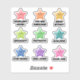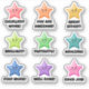 Conjunto de 9 adesivos de estrelas cortadas em todas as tonalidades do arco-íris, de cor rosa quente a laranja a limão a verde a azul a roxo a legal tom de rosa com palavras encorajadoras para dar aos seus alunos o seu excelente trabalho! O texto é personalizável caso você queira mudar o texto inspirador.