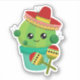 Um decal de vinilo com uma ilustração fofinha de um cacto verde redondo e cacto, com grandes olhos kawaii, sorrindo e vestindo um sombrero vermelho. Dentro de um pote de flores. Um par de maracas coloridas ao seu lado.