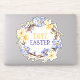 Um adesivo de solteiro de uma coroa floral amarela e púrpura que inclui as palavras "FELZ PASCOA"