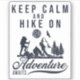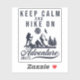 Este Sticker é perfeito para um entusiasta de caminhada. Mostre o quanto você adora caminhar enfeitando seu carro, computador, garrafa d'água etc. com este adesivo divertido. A design apresenta as palavras "Mantenha Calma e Caminhe", e "Aventura Aguarda" com uma silhueta de um cavaleiro, montanha, árvores, sol, pássaro e grama entre as palavras. Isso vai fazer um presente de excelente para um caminhador. Design feito em Kittl.