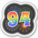 Este design divertido e excitante adesivo apresenta um padrão colorido inspirado em fogos de artifício comemorativos que explodem, juntamente com o número "94", tendo um espectro de inspiração multicolorido no arco-íris ou um padrão de gradiente. Um adesivo divertido como este talvez possa ser usado na celebração do nonagésimo quarto aniversário de alguém, ou talvez do nonagésimo quarto aniversário de casamento de um casal, ou de algum outro evento do 94º aniversário. [~Z0000362]