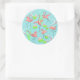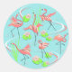 Os flamingos rosas e vivos batem suas asas e enrolam suas penas contra um fundo azul-d'água com verduras e lírios d'água. Um design de na moda com um toque retrorreflector que pode ser personalizado com seu próprio texto, imagens e ideias. Uma imagem de arte digital original criada por Quirky Chic.