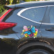 Dragão preto e azul com asas de borboletas azuis aninhadas entre um buquê de flores coloridas num pano de fundo de azul de voo