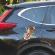 Retrato de uma girafa fofa contra um pano de fundo amarelo com flores cor-de-rosa.