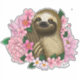 Uma preguiça bonita sentada entre flores cor-de-rosa, todas sobre um pano de fundo azul