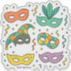 A playful burst of colorful carnival masks swirling through confetti and streamers, in comic style