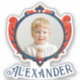 Este adesivo adorável e encantador apresenta uma foto personalizável do seu pequeno príncipe enquadrado dentro de um na moda real Casaco de design de Armas. Colocado em um estilo clássico e heráldico, evoca a sensação de um emblema familiar real de conto de fadas. A tipografia branca, elegante e medieval, soletra o nome, acrescentando um toque real brilhante, mas nobre, que complementa perfeitamente a Casaco de Braços. Este adesivo personalizado faz uma decoração única e emocionante para qualquer presente de aniversário, criando uma manutenção especial e divertida para seu pequeno príncipe ou princesa.