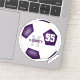 Este adesivo desportivo simples para raparigas apresenta uma bola de futebol tradicional com painéis roxos e brancos - personalizados com o nome do jogador, o monograma e o número de camisa - de katz_d_zynes