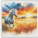 Um cavalo gracioso galope através de campos de trigo ouro, com um pôr do sol dramático iluminando o céu em tons vibrantes de laranja e azul. O fundo apresenta celeiros e aves distantes voando, criando uma atmosfera serena rural.