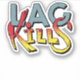 design de piada de jogos legal com a citação "matares de latência". As letras são feitas com sombra preta, o pano é azul, os matares são amarelos com cinzas vermelhas.