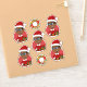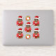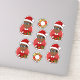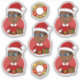 Conjunto de sete adesivos de vinilo cortados com uma ilustração de um menino americano africano sorridente e feliz com óculos, que está vestido de Natal e veste um chapéu vermelho de Papai Noel, em fundo vermelho; cinco adesivos do menino e dois adesivos com uma coroa de Natal