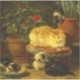 Vinheta com os Cristóvão de pintura a óleo de Henriëtte Ronner-Knip (1821-1909). Uma gata-mãe olha enquanto seus quatro gatinhos estão brincando em uma cadeira, planta e tigela de comida. Um presente perfeito para amantes de gatos e entusiastas do Romantismo.
