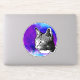 Tire proveito exclusivo do seu decor de laptop com este adesivo de tendência. Tem um design de gato detalhado preto e branco. O fundo é uma nebulosa circular roxa e azul. Os gatos espaciais são para sempre!