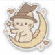 Um gatinho kawaii de olhos redondos vestindo um chapéu de bruxa, sentado em uma lua crescente brilhante enquanto segurava uma varinha minúscula. Perfeito para amantes do Halloween que adoram vibrações confortáveis e mágicas!