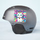 Gatinho branco, bonito, branco e cartoon com olhos azuis grandes, orelhas cor-de-rosa e vestindo um colar colorido brilhante. Ela tem uma cauda azul, rosa e branca listrada e uma faixa azul na cabeça. O fundo é na sua maioria roxo com planetas, nuvens, estrelas e flores numa mistura de cores arrojadas, brilhantes e vibrantes. Ideal para quem ama gatos e espaço.