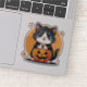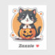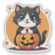 Gato preto e branco sorridente em arte kawaii de Halloween, projetado para adesivos, artesanatos e papelaria festiva.
