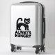 Gato preto estilizado com olhos grandes e uma expressão brincalhona. O corpo do gato é projetado em uma forma simples e moderna, enfatizando sua cauda curva e forma arredondada. Abaixo do gato, a frase “SEMPRE COM FOME” é exibida em letras negrito, também em preto. O design geral é minimalista, usando uma paleta de cores monocromática que aumenta seu apelo visual. A combinação do gato e do texto cria um tema humorístico e encantador, provavelmente atraente para os amantes de gatos.