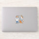 This veterinarian themed sticker set designed by Destei features a cute collection of veterinary illustrations. The set includes a cartoon girl veterinarian who is wearing a white lab coat, blue scrubs and a hat with a blue paw print. There is also a brown and white puppy, an orange cat, a syringe with yellow liquid, a blue thermometer, a bandage and three blue paw prints.