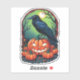 Vinheta num corvo preto estrelado sobre uma jack-o-lanterna, num pedaço de abóbora, contra árvores assustadoras e uma lua de cheio