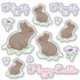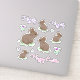 Aproveite esses adesivos bonitos com coelhos pintados realisticamente com narizes cor-de-rosa sentados em um patch de trevo, pequenas flores brancas e roxas e amarelas, juntamente com texto roxo e rosa que diz "Hippity Hoppity Felz pascoa".