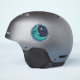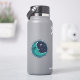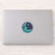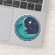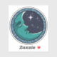 Lua azul crescente com o rosto de um homem dormindo em um céu noturno estrelado. Parte do seu rosto é iluminada por uma estrela brilhante branca. O design é definido como dentro a borda azul do círculo com pequenos pontos brancos e azuis.