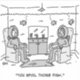 Cartoon mostra um casal sentado em sua sala inundada, vestindo fatos de mergulho no mar profundo. Seus peixes tropicais estão nadando ao seu redor. A esposa do homem diz: "Você estraga esses peixes".