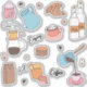 Esses encantadores adesivos temáticos ao café apresentam imagens como copos de café, potes, pacotes e filtros.