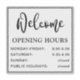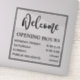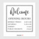 Quadrado, cling de janela de horário de abertura com o texto "bem-vindo" em uma letra elegante de script de caligrafia e suas horas de abertura. Texto negro sobre um fundo transparente.