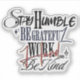 Start each day grounded in gratitude and purpose with this inspirational sticker featuring the words “Stay Humble, Be Grateful, Work Hard, Be Kind.” Designed in a modern handwritten style with black, blue, and red tones, this positive mindset calligraphy helps you align with personal growth, resilience, and discipline. Whether you're on a self-improvement journey, embracing mindfulness, or simply need a motivational reminder, this hand-lettered script text reflects your values. It also makes a thoughtful gift for anyone passionate about mindset, leadership, wellness, or coaching.