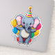 Celebrate a magical first birthday with this adorable sticker featuring a smiling baby elephant wearing a party hat, surrounded by cheerful balloons and bright confetti. Perfect for party décor, invitations, and memory books—this design captures the wonder of turning one with irresistible cuteness!